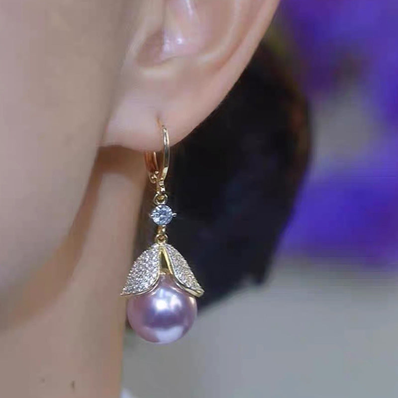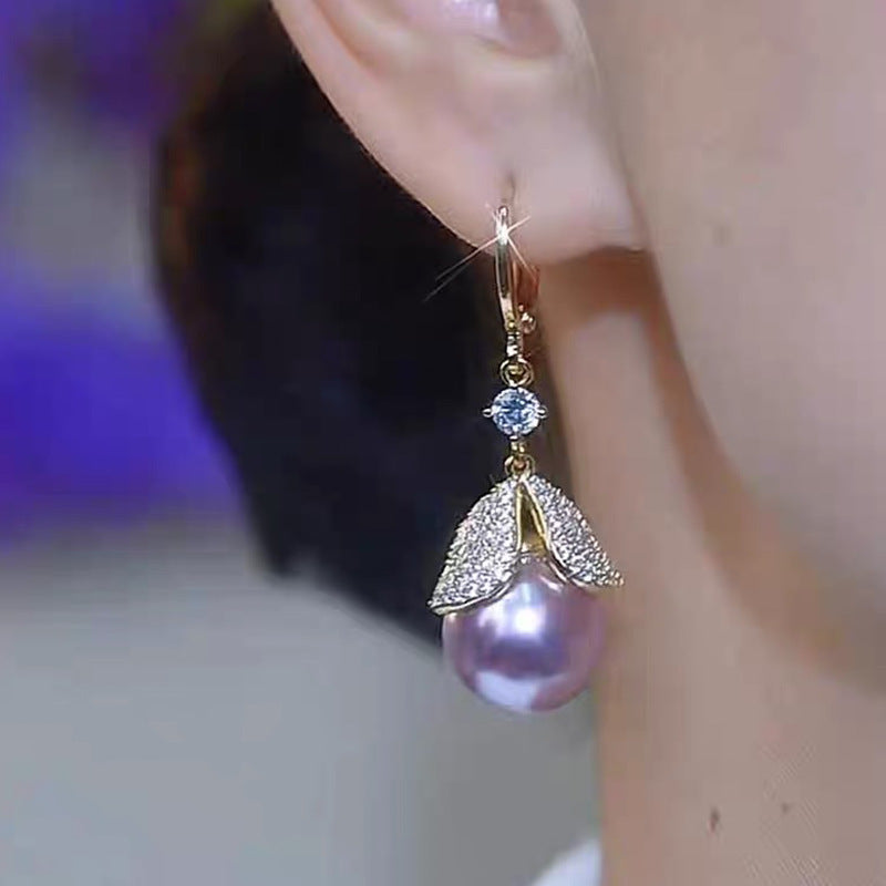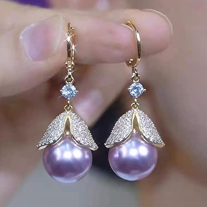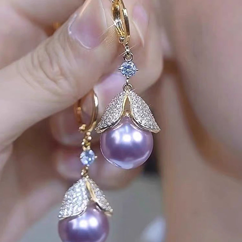 Elegantes pendientes de hojas de diamantes y perlas moradas