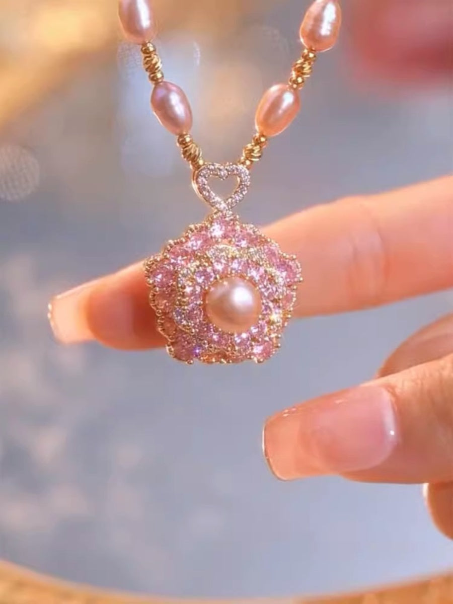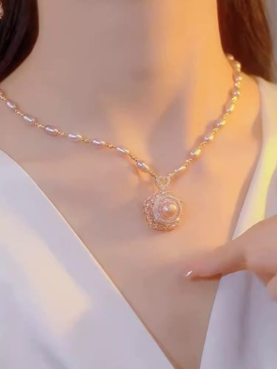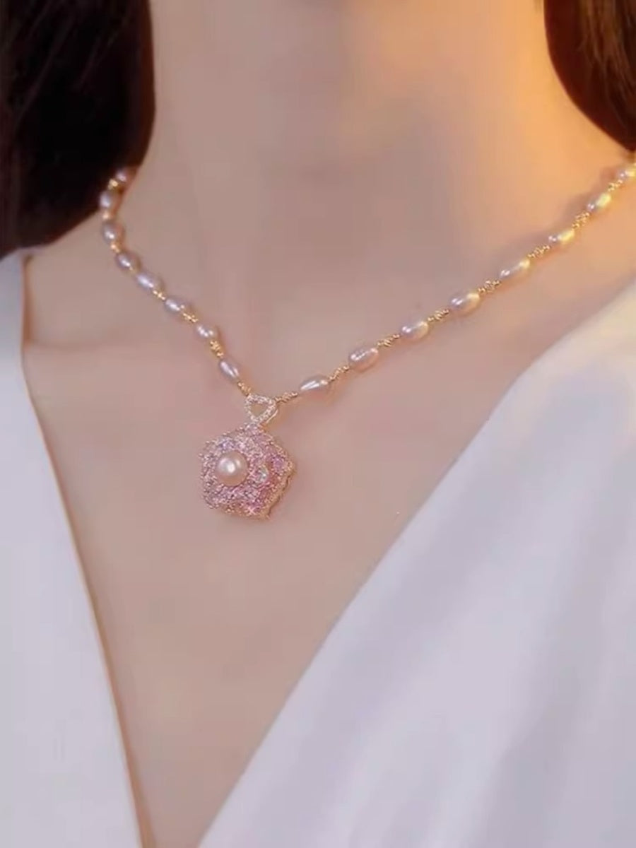 Collar de perlas con colgante de flores